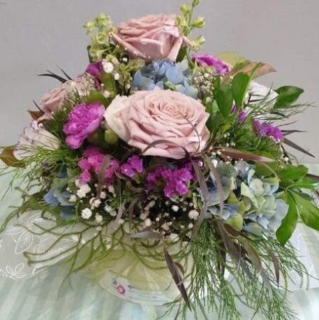 A simply delightful arrangement of seasonal blooms in shades of soft purples, blues and whites will delight the most discerning of flower lovers. Designed to be ready to enjoy from the moment it arrives. Presented in a gorgeous box or hatbox, it is a beautiful choice for any occasion, popular for birthdays, sympathy and new babies. Ready to just put on a table and enjoy, no need to find a vase. So simple!