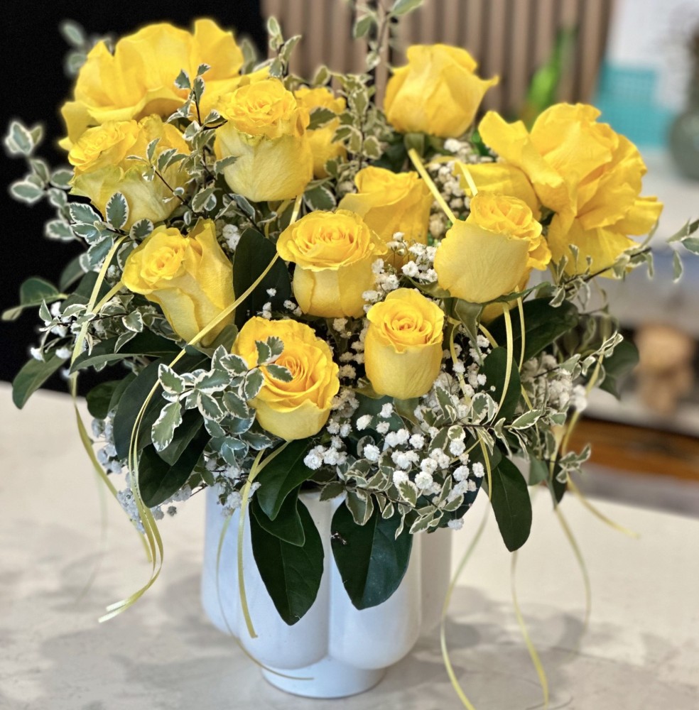 Hand delivered and complete in a basket or a ceramic pot if you prefer. Bright and beautiful design featuring yellow roses, baby's breath or similar and lush foliage. A simply gorgeous arrangement for someone special on any occasion. Popular choice for wedding anniversaries, new babies and birthdays!